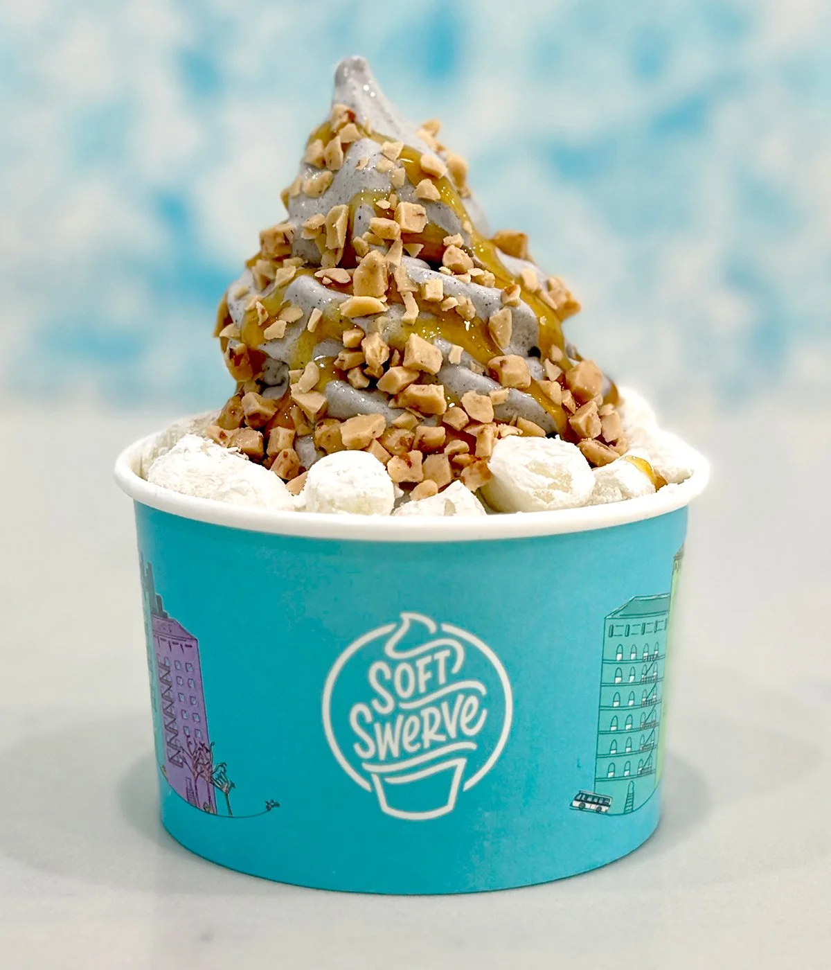 Bold black sesame soft serve topped with soft mochi bites, buttery toffee pieces, and a caramel drizzle - nutty, sweet, and irresistibly rich with layers of texture.