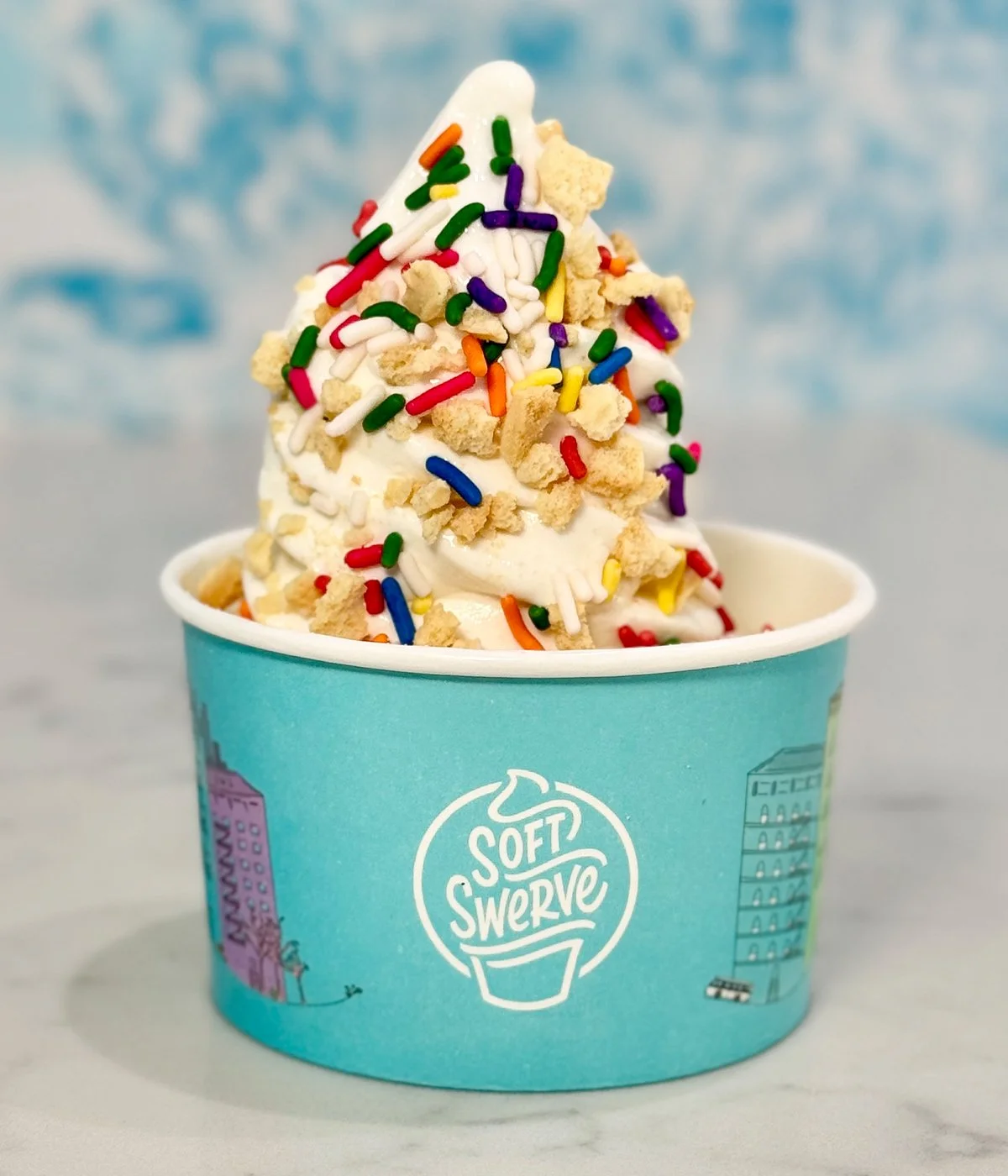 Classic vanilla soft serve coated in crushed vanilla cookies and rainbow sprinkles for a fun, celebratory scoop that tastes like cake batter and childhood memories.